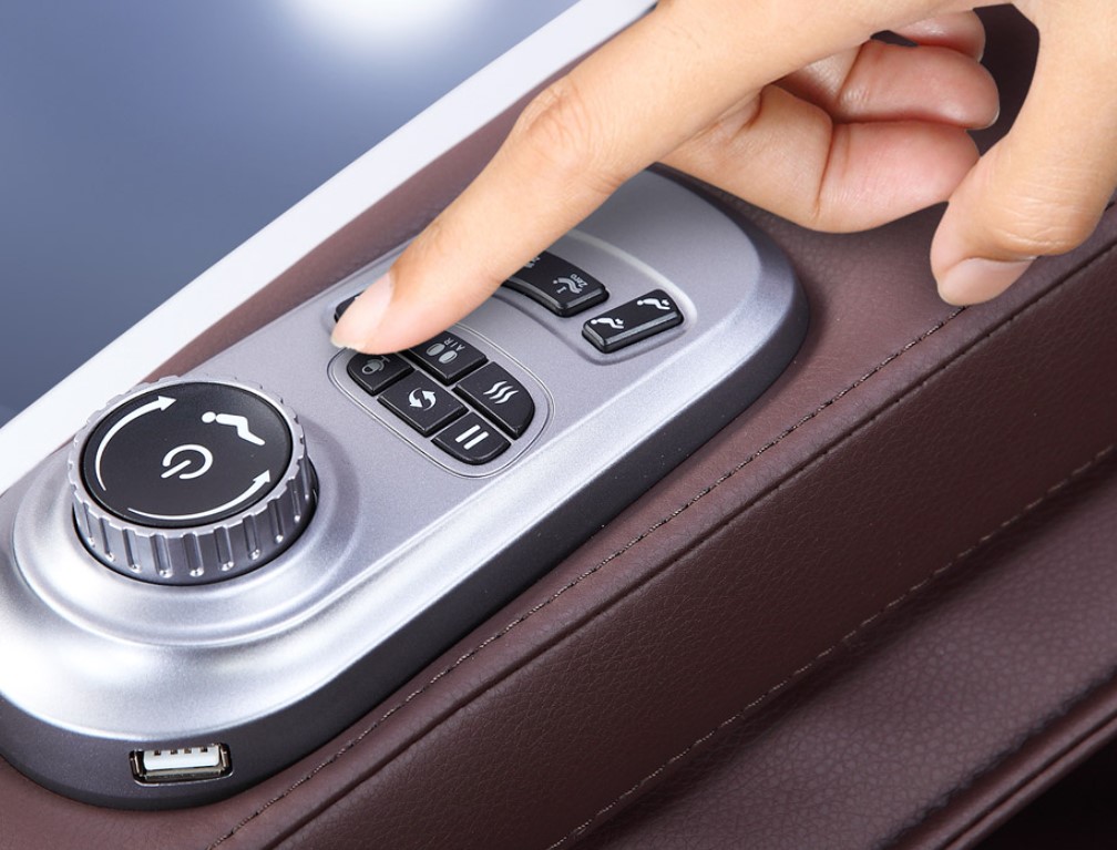 Кресло FLEXOR оснащено русифицированным пультом с цветным TFT-дисплеем и удобной встроенной панелью управления в подлокотнике, включающей джойстик для регулировки 3D-массажа.